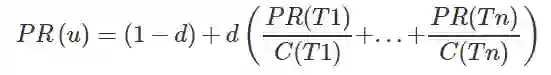 其中,u 是我们想要计算 PageRank 的网页,T1 到 Tn 是引用的网页。d 被称为阻尼系数(damping factor),代表一个用户继续点击网页的概率,一般被设置为 0.85,范围 0~1。C(T) 是节点 T 的出度。
