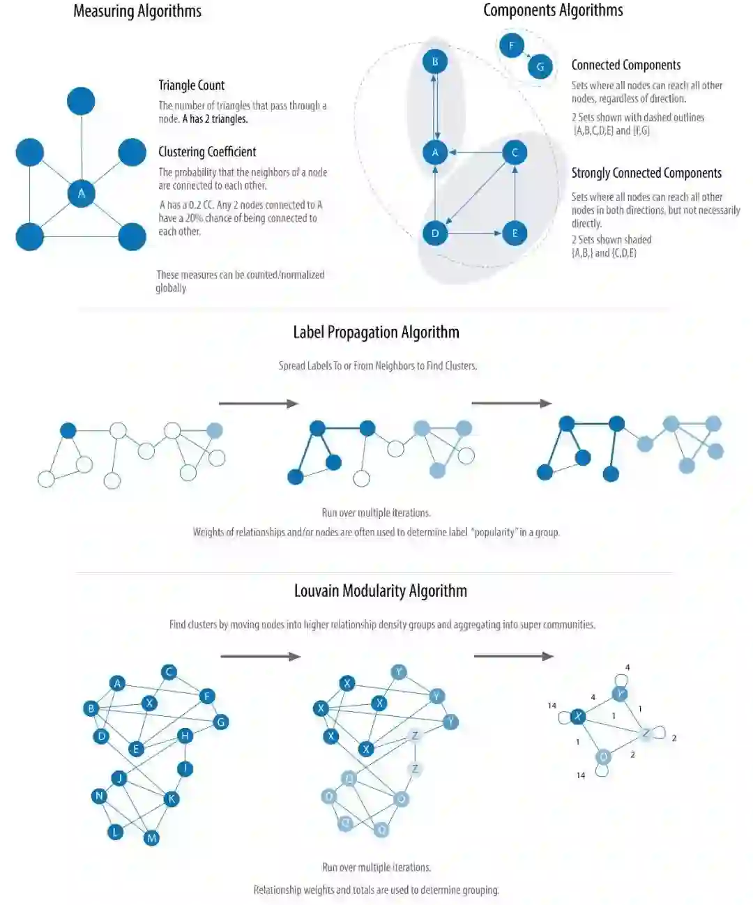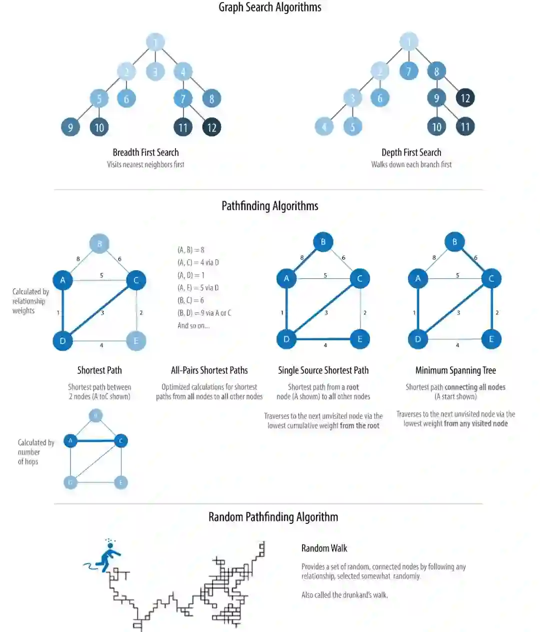 基本的图算法可以通过处理权重来代表关系的强度。许多算法通过计算指标,用作后续算法的权重。也有些算法通过更新权重值,来查找累计总数、最小值或最优化结果。