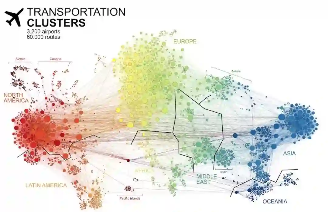 图分析和图算法具有广泛的应用潜力:从防止欺诈,优化呼叫路由,到预测流感的传播。下图是 Martin Grandjean 创建的航线网络图,这幅图清楚地展示了航空运输集群高度连接的结构,帮助我们了解航空运力如何流动。航线网络采用典型的辐射式结构(hub-and-spoke structure),这样的结构在有限运力的前提下,增大了航线的网络的始发-到达对(OD Pair),然而却也带来了系统级联延迟的可能。
