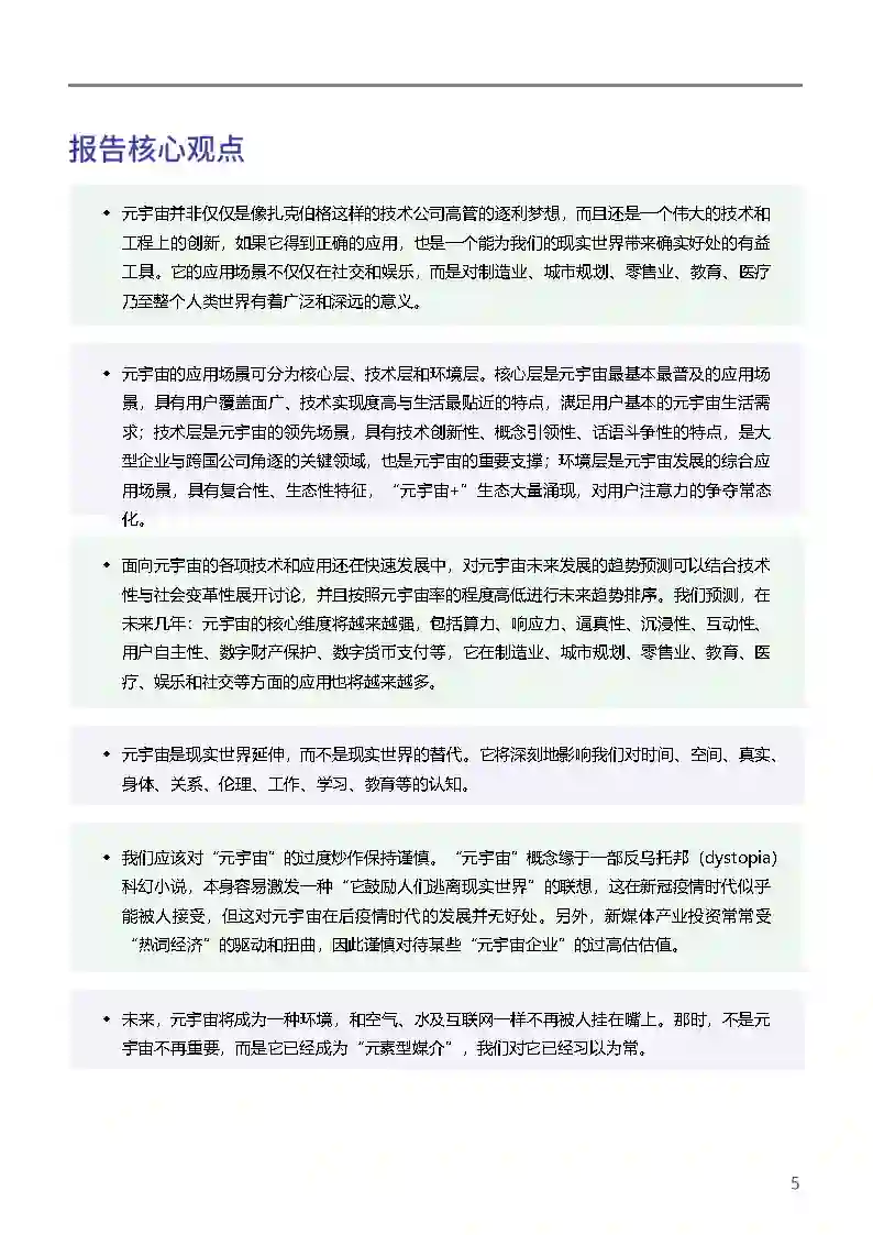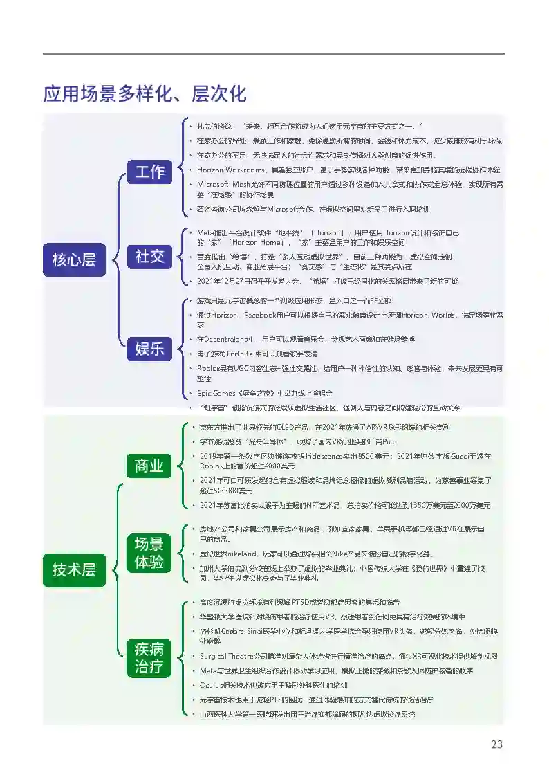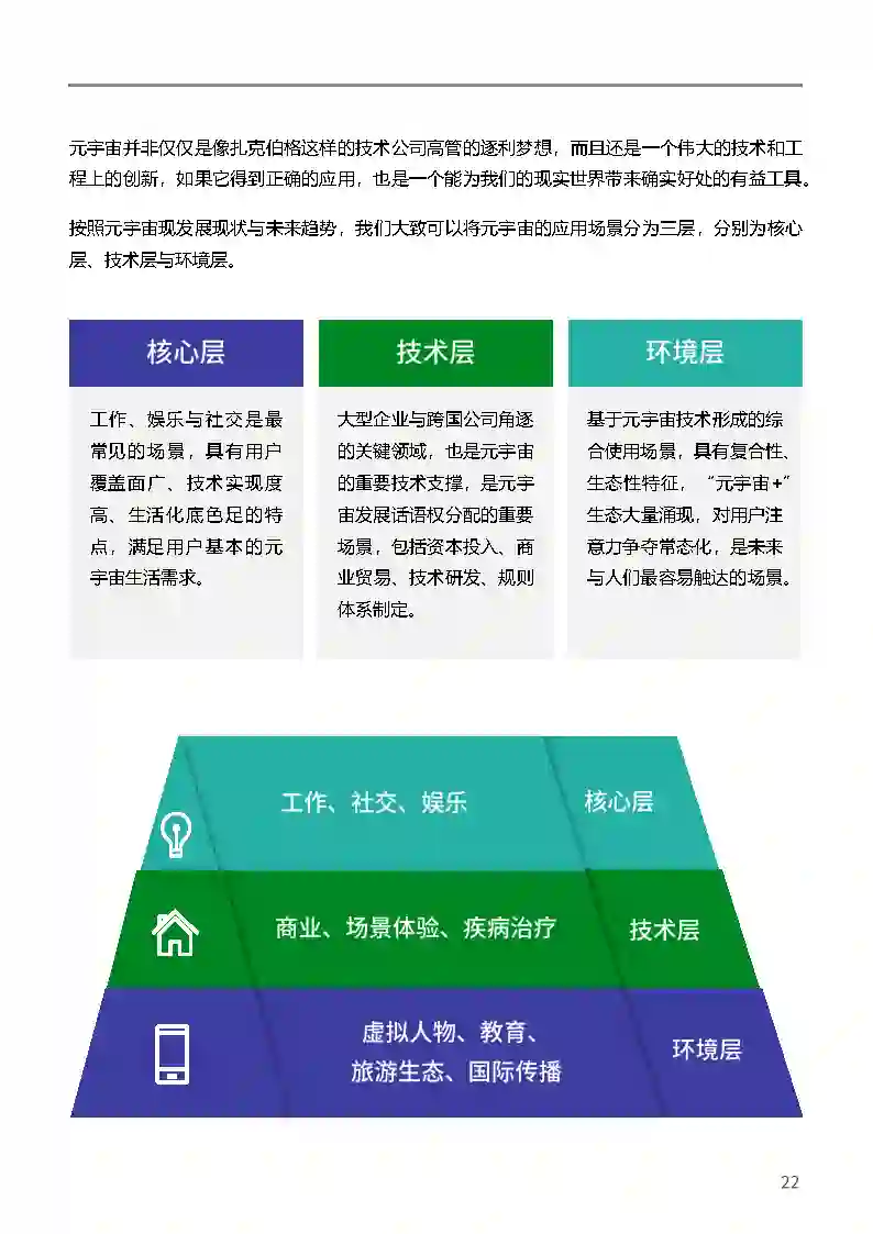 元宇宙的应用场景可分为核心层、技术层和环境层。核心层是元宇宙最基本最普及的应用场景,具有用户覆盖面广、技术实现度高与生活最贴近的特点,满足用户基本的元宇宙生活需求;技术层是元宇宙的领先场景,具有技术创新性、概念引领性、话语斗争性的特点,是大型企业与跨国公司角逐的关键领域,也是元宇由的重要支撑;环境层是元宇宙发展的综合应用场景,具有复合性、生态性特征,“元宇宙+”生态大量涌现,对用户注意力的争夺常态化。