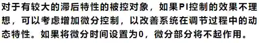 微分作用主要是用来克服被控对象的滞后,常用于温度控制系统。除采用微分作用外,在使用控制系统时要注意测量传送的滞后问题,如温度测量元件的选择和安装位置等。