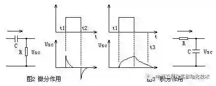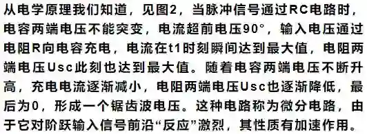 我们再来看图3,脉冲信号出现时,通过电阻R向电容充电,电容两端电压不能突变,电流在t1时刻瞬间达到最大值,电阻两端电压此刻也达到最大值。电容两端电压Usc随着时间t不断升高,充电电流逐渐减小,最后为0,电容两端电压Usc也达到最大值,形成一个对数曲线。这种电路称为积分电路,由于它对阶跃输入信号前沿“反应”迟缓,其性质是“阻尼”缓冲作用。