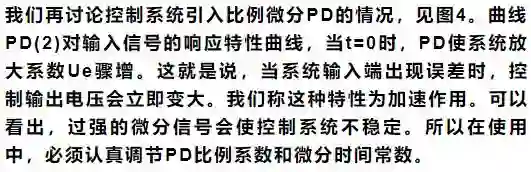 误差的微分就是误差的变化速率,误差变化越快,其微分绝对值越大。误差增大时,其微分为正;误差减小时,其微分为负。控制器输出量的微分部分与误差的微分成正比,反映了被控量变化的趋势。