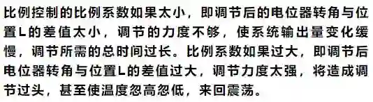 比例控制器实际上就是个放大倍数可调的放大器,即△P=Kp×e,式中Kp为比例增益,即Kp可大于1,也可小于1;e为控制器的输入,也就是测量值与给定值之差,又称为偏差。