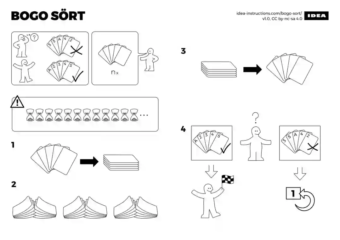 Bogo 排序也被称为“愚蠢的排序”,是一种非常简单但低效的排序算法,就是不断打乱元素的顺序,直到达到有序为止。