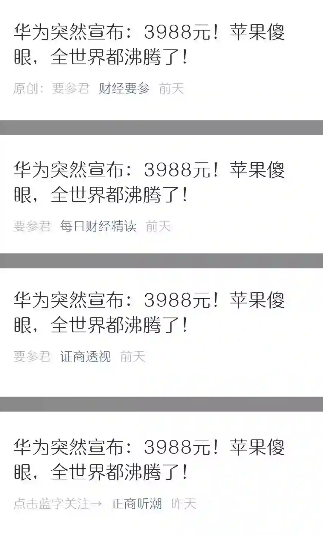 其中更是有一篇《华为突然宣布:3988元!苹果傻眼,全世界都沸腾了!》的文章在笔者的微信朋友圈被大肆转发,这篇文章夸张的写道:
