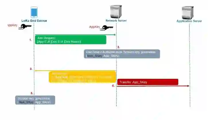 OTAA激活流程,也叫入网流程,该过程在发送实际数据之前生成每个设备的NwkSKey、DevAddr和AppSKey。