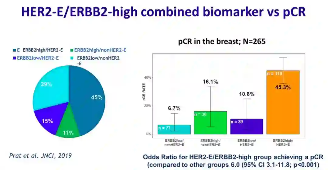 Prat 博士对TBCRC 06、TBCRC 023和PAMELA研究进行了分析,患者均为ER阳性,接受曲妥珠单抗+拉帕替尼±内分泌治疗。研究只是使用ERBB2mRNA和HER2富集亚型简单分层,发现约45%患者只需抗HER2双靶向治疗,无需化疗即可获得pCR(图4)。