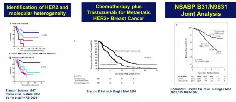众所周知,HER2阳性乳腺癌的治疗取得巨大进展。1987年首次证实HER2分子亚型,当时的数据显示此类患者结果很差;2001首次有临床研究证实化疗联合曲妥珠单抗可改善HER2阳性晚期乳腺癌的无进展生存和总生存;2005年ASCO会议上,NSABP B31和N9831联合分析表明,化疗联合曲妥珠单抗辅助治疗能明显改善早期HER2阳性乳腺癌的无病生存和总生存。