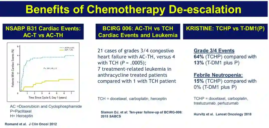 现有乳腺癌治疗成功的降低了死亡率,如何在保有获益同时减少治疗毒性是一直追求的目标。辅助治疗中减少化疗或不使用化疗,仅采用靶向治疗是否可行?这是一个非常重要的话题。NSABP B31研究中,AC-T化疗基础上加用曲妥珠单抗成为AC-TH方案,虽然疗效改善,但心脏事件明显增多,BCIRG006研究将AC-TH方案中的蒽环类药物去除后,严重心脏事件减少且治疗相关白血病减少;KRISTINE研究中T-DM1+帕妥珠单抗治疗患者的3/4级不良事件和发热性中性粒细胞减少明显减少;APT研究中早期HER2阳性乳腺癌只接受紫杉醇+曲妥珠单抗辅助治疗,结果依旧良好,所以I期HER2阳性乳腺癌完全不必进行强烈治疗。上述研究结果提示,减少化疗,减少治疗相关毒性具有可行性。