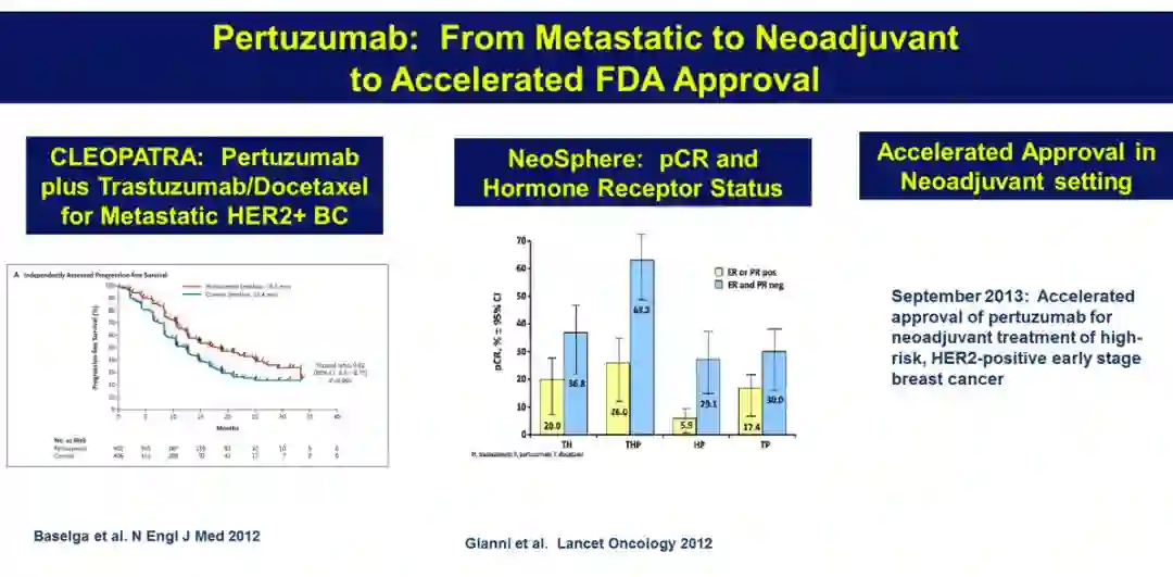 过去10~15年里,新辅助治疗成为乳腺癌治疗模式的标志性改变,新辅助治疗后手术评估治疗反应是否为完全病理缓解(pCR),对判断患者长期结果非常关键。帕妥珠单抗是另一种靶向HER2的单克隆抗体,可用于HER2阳性乳腺癌的全程治疗,最初因CLEOPATRA 研究获FDA批准治疗晚期HER2阳性乳腺癌,总生存提高约16个月,几乎同时帕妥珠单抗公布了新辅助治疗NeoSphere研究结果,并于2013年获FDA加速审批新辅助治疗HER2阳性早期乳腺癌,pCR率的改善是获批的重要因素,仍需最终证实可改善无病生存。APHINITY研究显示,辅助化疗采用化疗+曲妥珠单抗+帕妥珠单抗较化疗+曲妥珠单抗+安慰剂有更多获益,但获益改善很小,不过淋巴结阳性和激素受体阴性患者获益非常显著,临床实践中此类患者应考虑使用化疗+曲妥珠单抗+帕妥珠单抗治疗。