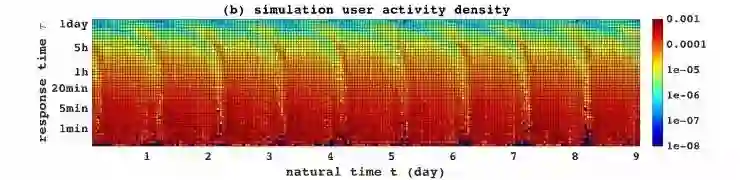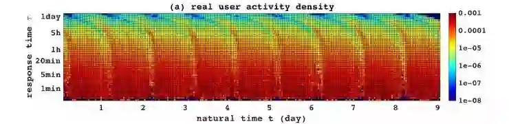 从图中可以很明显发现:随着响应时长的变化,用户的活跃度也不断发生变化。与此同时,响应时间密度函数在自然时间尺度也呈现出了周期性的变化趋势。这些现象表明,社会用户行为动力学在多重时间维度均存在异质性。尽管目前已有一些模型分别解决了用户交互行为在响应时间和人类行为昼夜变化的规律,但是这些模型均无法同时对这两个组成部分进行建模,导致在对用户交互行为进行建模和预测时产生偏差。