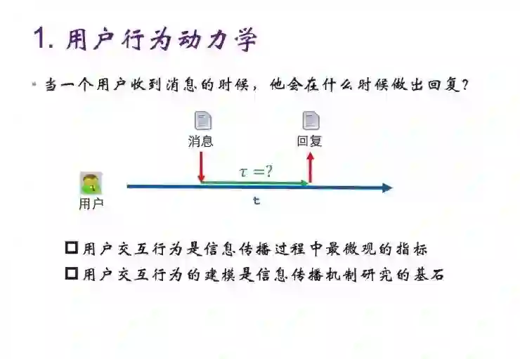 目前,学界中已尝试提出了一系列模型对用户行为动力学进行刻画。这当中,大部分模型假设了个体与个体之间的相互作用是高度随机的,遵循泊松过程。最近,一些工作在真实数据中发现,个体行为在响应时间维度(即一个人收到一个消息的时间到他做出一个响应的时间之间的持续时间)以及事件间时间维度(即同一人相邻两个行为之间的持续时间)均存在非常奇异的模式: