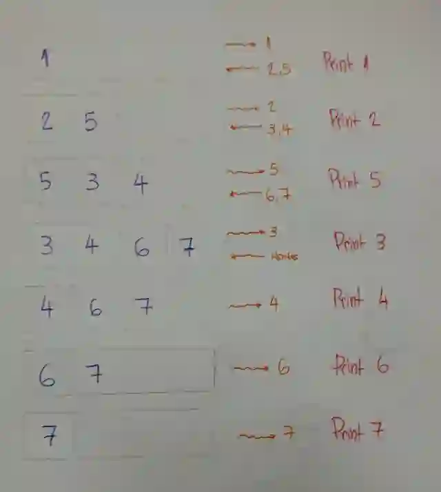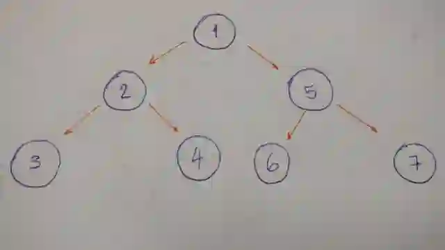 我们来一层一层的遍历这棵树。本例中,就是1-2-5-3-4-6-7.