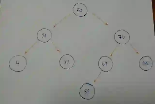 现在想像一下我们有一棵空树,我们想将几个节点添加到这棵空树中,这几个节点的值为:50、76、21、4、32、100、64、52。