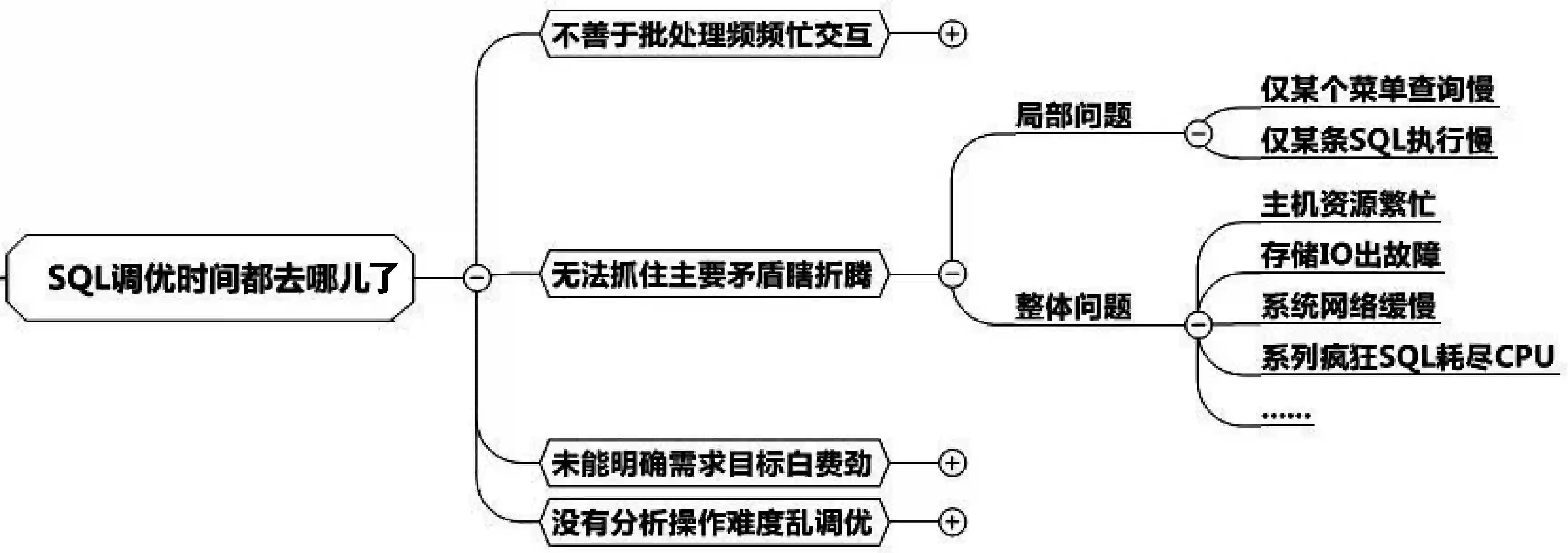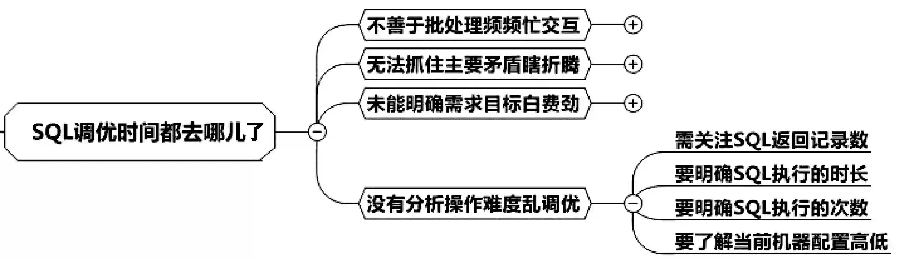 我们先来分析调优时间都去哪儿了。1小时才能得到解决方案固然让人接受不了,事实其实更糟糕,小王是只花费1小时吗?显然不止1小时!