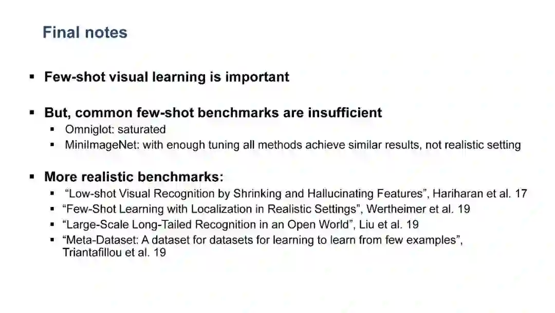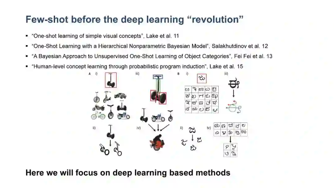 在过去的几年里,基于深度学习的方法在图像理解问题上取得了令人印象深刻的效果,如图像分类、目标检测或语义分割。然而,真实字计算机视觉应用程序通常需要模型能够(a)通过很少的注释例子学习,(b)不断适应新的数据而不忘记之前的知识。不幸的是,经典的监督深度学习方法在设计时并没有考虑到这些需求。因此,计算机视觉的下一个重大挑战是开发能够解决这方面现有方法的重要缺陷的学习方法。本教程将介绍实现这一目标的可能方法。小样本学习(FSL)利用先验知识,可以快速地泛化到只包含少量有监督信息的样本的新任务中。