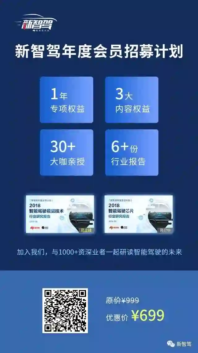 新智驾会员计划3大服务,30场+「大咖Live」,6+专业研报。现699元优惠中,《2018智能驾驶芯片行业研究报告》即将发布,扫码抢购,与1000+资深者一起研读智能驾驶的未来。