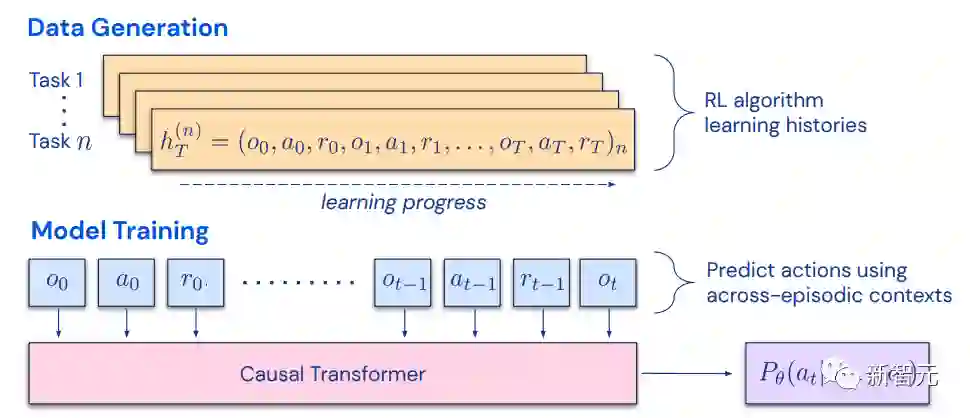 一旦收集完学习历史的数据集,就可以训练一个Transformer来预测之前的学习历史的行动。