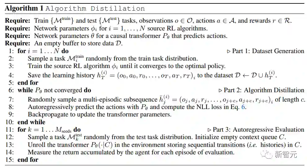 基于此,DeepMind提出了算法蒸馏(Algorithm Distillation, AD) ,通过建立因果序列模型将强化学习算法提取到神经网络中。
