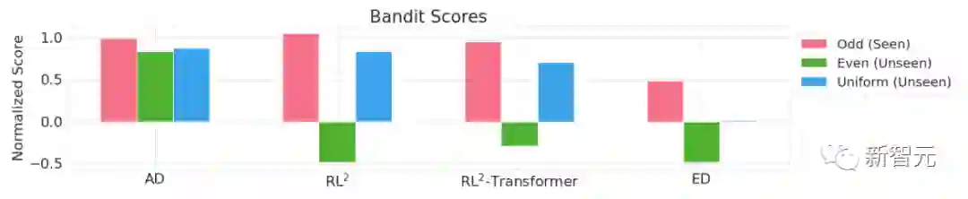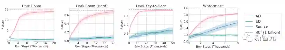 AD 可以提取任何 RL 算法,研究人员尝试了 UCB、DQNA2C,一个有趣的发现是,在上下文 RL 算法学习中,AD更有数据效率。