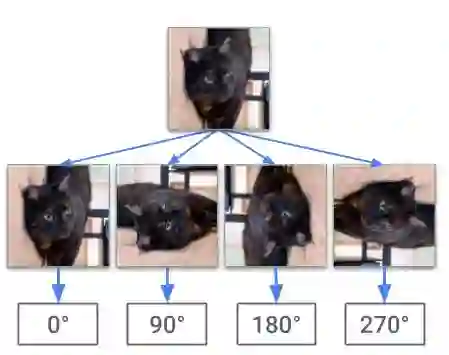图注:这张未标记图像被随机旋转,而网络的任务则是预测旋转角度。成功的模型需要捕获具有语义的图像特征,而这样的特征也可以将其用于其他视觉任务。