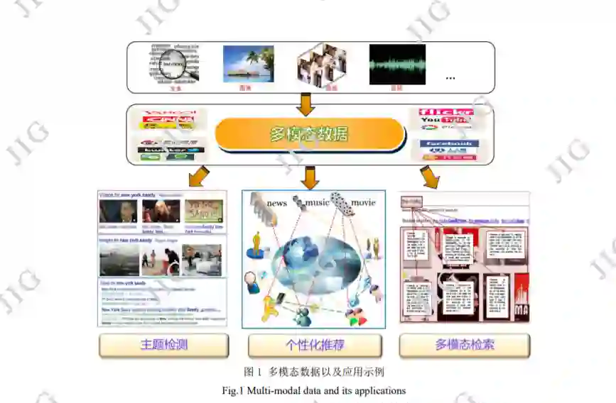 在过去的二十几年里,不同类型的媒体数据如文 本、图像和视频迅速增长。通常,这些不同类型的 数据用于描述相同的事件或主题。例如,网页通常 不仅包含文本描述,还包含与之匹配的图像或视频。这些不同类型的数据被称为多模态数据,表现出模 态间异构特性并具有广泛的应用,如图 1 所示,互 联网与社交媒体涌现的大规模多模态数据可以用于 进行主题检测、信息推荐、检索等。