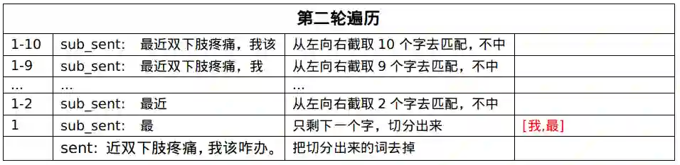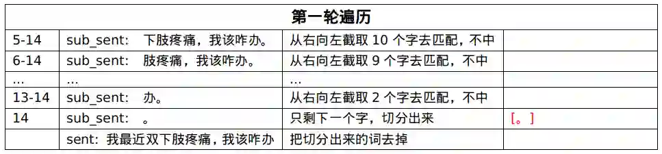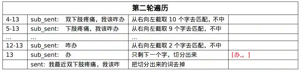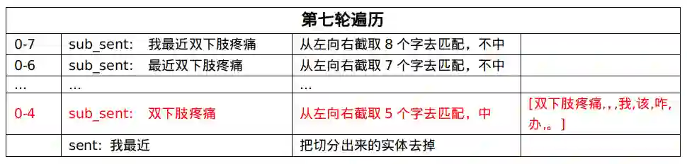 第四轮遍历,匹配中了[双下肢疼痛],就把这个实体从句子中剔除,拿剩下的句子继续匹配。