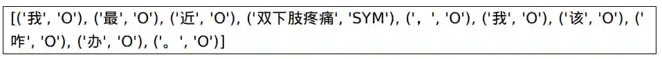 [('我', 'O'), ('最', 'O'), ('近', 'O'), ('双下肢疼痛', 'SYM'), ('。', 'O')]