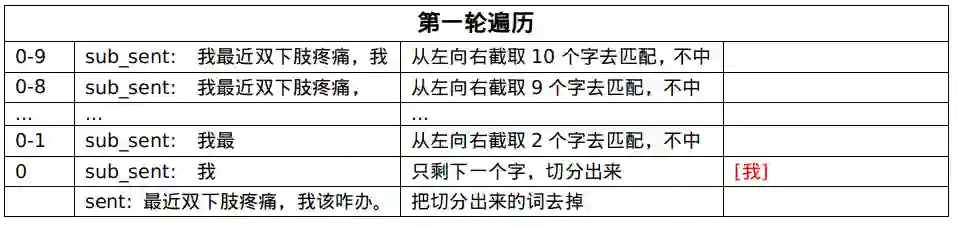 按最大长度匹配不中,那么最大长度减一,再去截取句子片段,去词典中匹配,直到匹配中,或者截取的长度减小至一。