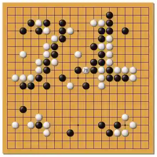 李世石执白对阵 AlphaGo,李世石的第 78 手被认为是载入史册的妙手。中国著名棋手古力当时评论道:「如果这盘棋能赢,就是千古名局。」