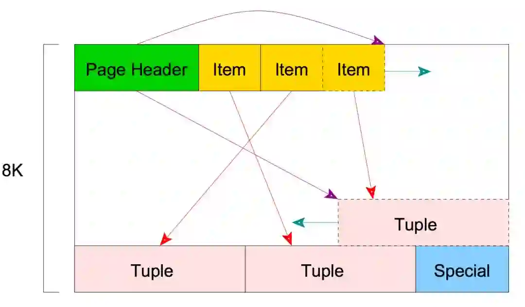 页结构看起来就像上图所示。它包含一些我们不打算在这里讨论的条目,但是它们包含关于页的元数据。条目后面的项是一个数组标识符,由指向元组或数据行的(偏移、长度)对组成。在Postgres中,相同记录的多个版本可以以这种方式存储在同一页面中。