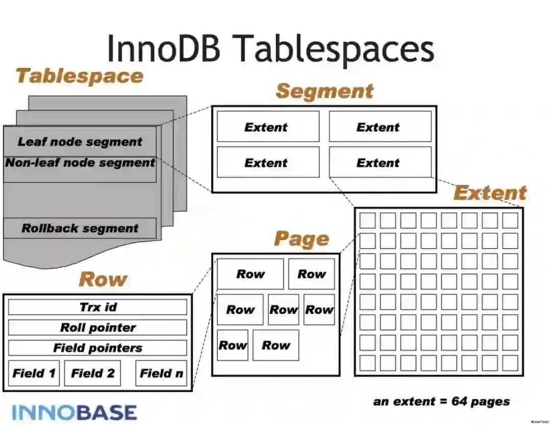 MySQL的表空间结构与Oracle相似,它有多个层次,包括层、区段、页面和行层。
