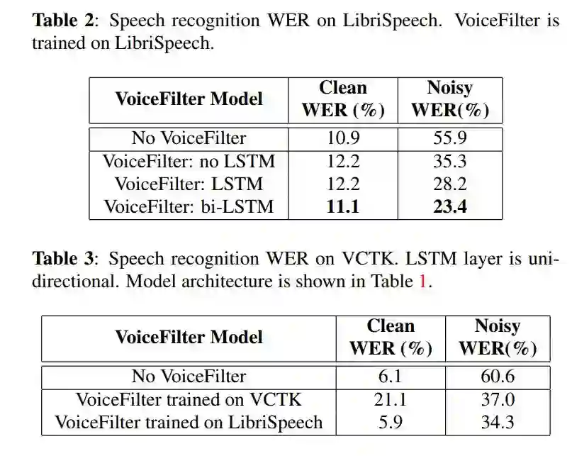 VoiceFilter 系统分别在公开数据集 LibriSpeech 和 VCTK 上进行了试验。将训练好的 VoiceFilter 网络同时作用于多人环境与单人环境的测试集。在固定语音识别器不变的情况下,VoiceFilter 将多人环境下的语音识别词错率(Word Error Rate)从 55.9% 降至 23.4%,提升率超过 50%!在单人环境下,VoiceFilter 的词错率也维持在了正常波动范围内:从 10.9% 变化到了 11.1%。而在 VCTK 数据集上,VoiceFilter 则同时降低了多人环境与单人环境下的词错率。