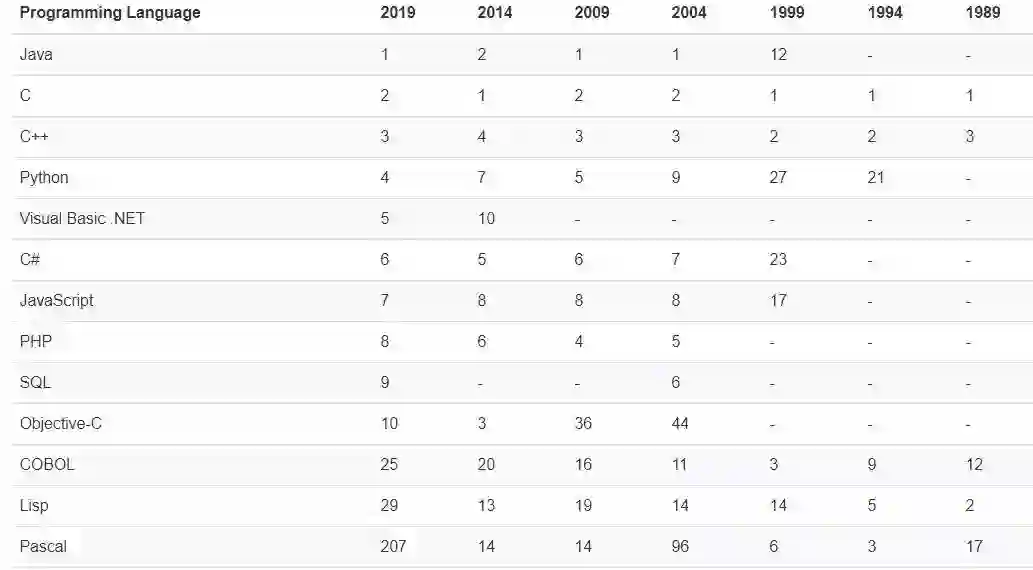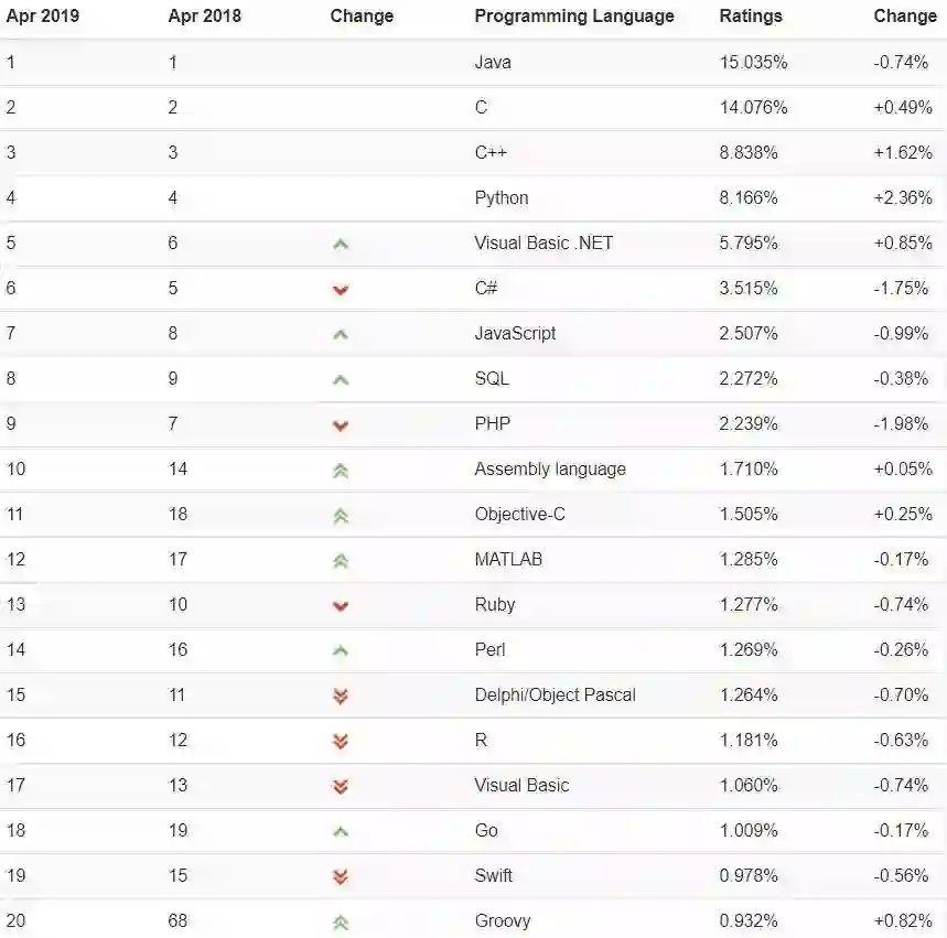 TIOBE 公布了2019年4月编程语言排行榜,总体排名变化不大,排名前十的分别是:Java, C, C++, Python, Visual Basic .NET, C#, JavaScript, SQL, PHP 和汇编语言。本月C语言和C++都强势增长,C语言大有超越Java的趋势,C++则回到第三位置。