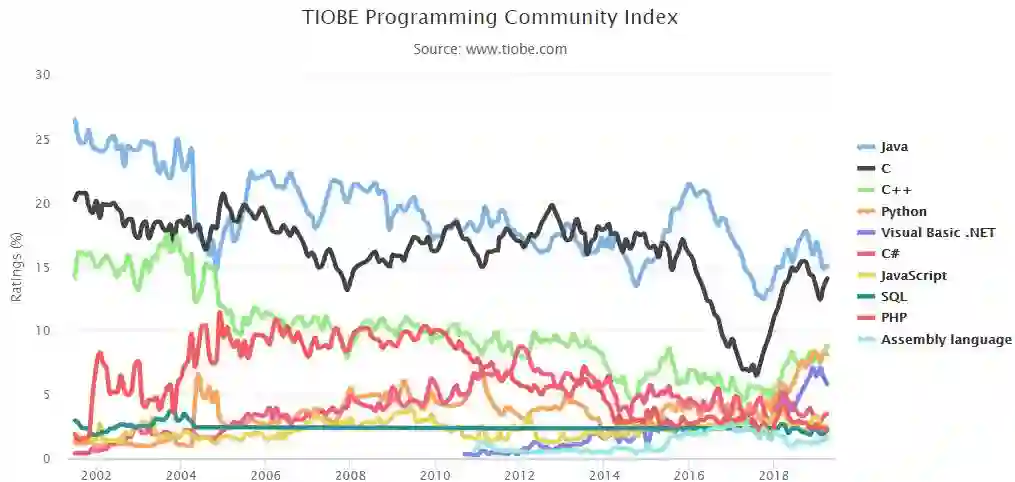 Top 10 编程语言 TIOBE 指数走势(2002-2018)