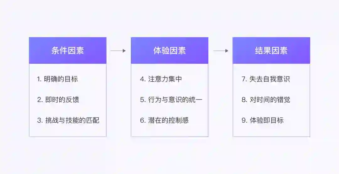心流体验的过程主要分为三个步骤:条件因素—体验因素—结果因素,进入心流状态首先要具备3个条件因素: