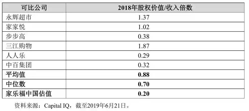 在公告中,为了说明家乐福中国的资产价值,苏宁国际为国内主要零售巨头的价值做了一张表格,根据2018年股权价值/收入倍数,永辉超市以1.37位列可比公司第一位,而家乐福中国估值仅有0.20。其他进入列表的公司包括家家悦等,同时这张列表并未列入中国线下超市两家龙头公司:华润万家和大润发。