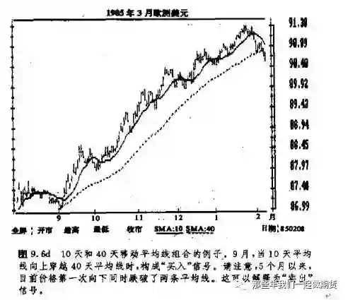 在本例中,系统是连续工作的,即它始终在市,要么处于多头状态,要么处子空头状态。在后一种情况中,当10天平均线向上穿越40天平均线时,则为上升趋势信号,当10天平均线向下穿越40天平均线时,则为下降趋势信号。同采用单移动平均线法相比,采用双移动平均线法在时间上滞后于市场更多一些,但由此也减少了拉拐现象。在后面,我们研究如何在具体市场上选择最佳平均线的间题时,还要继续讨论双移动平均线相交法。