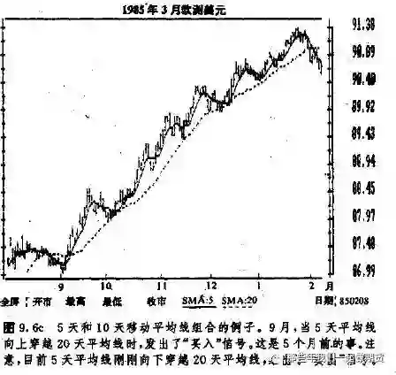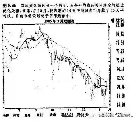 我们这里仍然主要谈简单移动平均值,暂且不管与之相对的加权平均值,或者指数加权平均值那两种变通办法 (当然,以后我们也要列出一个实例,看看组合使用两条指数加权平均线的情况)。有研究表明,两种简单平均线相组合,在各种可能的组合之中效果可能是最佳的。