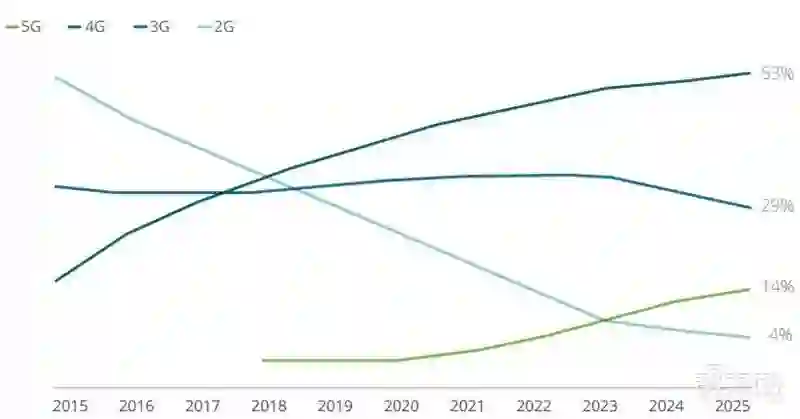 4G 于 2009 年末 2010 年初推出之后仅有小部分运营商在有限的部分地区提供 4G 服务。 18 虽然在推出后的10 年间 4G 网络的布局范围越来越广, 但直到 2019 年4G 才成为全球用户最多的无线联网技术。 全球移动通信系统联盟(GSMA) 的报告显示, 全球范围内的 4G网络用户要到 2023 年才能超过网络用户总数的 50%,距离 4G 网络的最初启用已过去 14 年。这意味着到2025 年, 5G 可能仍是一种相对小众的技术。 该年度的 5G 用户人数有望达到 12 亿人次, 但也仅占全球非物联网移动网络用户总数的 14%。 与此同时, 不同国家的 5G 网络应用情况也存在巨大差异: 到 2025 年,美国将有 49% 的用户使用 5G 网络, 日本、 欧洲、 中国的这一比例分别为 45%、 31%和 25%, 而拉丁美洲、中东和非洲的这一百分比仅为个位数。十年以后,供应商们可能仍在推广 5G。