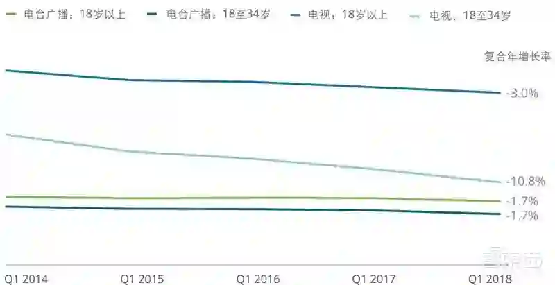 ▲年轻美国人的电视收看率下滑速度是电台广播收听率的三倍