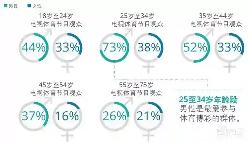男性通常被认为比女性观看更多的电视体育节目,而我们的研究也证实了这一点。 在美国, 49% 的 18岁至 24 岁美国男性观众 2018 年至少观看一个电视体育节目(包括直播体育节目、 体育脱口秀和精彩集锦), 而同龄女性比例为 26%。 与此相似, 25 岁至34 岁的美国观众中, 64% 的男性观看电视体育节目,女性仅为 37%。