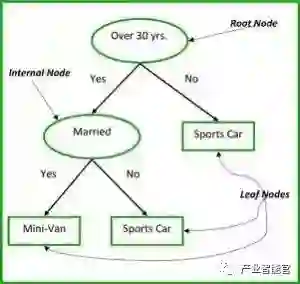 图3中的决策树根据年龄和婚姻状况分类是否会购买跑车或小型货车。如果这个人已经超过30岁,没有结婚,我们就像下面这样沿着树走:“30多岁吗?”- >是->结婚了吗?最后,该模型输出结果是一辆跑车。