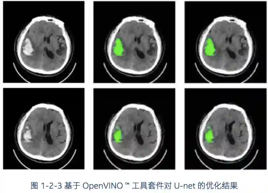 该方案采用面向英特尔架构优化的 TensorFlow(基于英特尔 MKL-DNN 优化) 以及 OpenVINO 工具套件进行优化,使基于 U-net 模型的深度学习推理在保证准确性的同时,推理时间得以大幅减少。