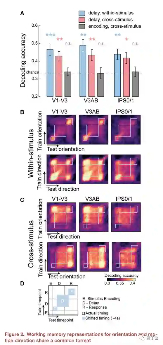 这也就印证了研究人员的一种推测:光栅倾斜和点集移动的图像属性既有不同点也有相同点,但在工作记忆过程中,大脑只会提取与具体任务最为相关的特征,并将两种不同的刺激编码为同一种“存储格式”。