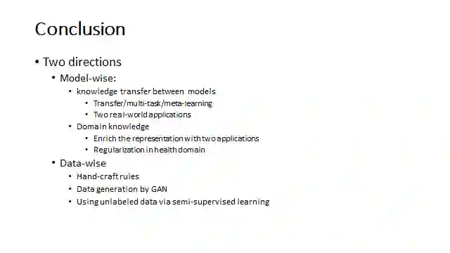 在大数据时代,我们很容易收集到大量的图像和文本数据。然而,在一些领域,例如医疗保健和城市计算,我们经常面对现实世界中只有少量(标记的)数据的问题。挑战在于如何使机器学习算法在处理小数据时仍能很好地工作?为了解决这个挑战,在本教程中,我们将介绍处理小数据问题的最新机器学习技术。我们特别关注以下三个方面:(1)全面回顾了近年来在探索知识迁移的力量方面取得的进展,特别是在元学习方面;(2)介绍了将人类/专家知识纳入机器学习模型的前沿技术;(3)确定了开放的挑战数据增强技术,如生成性对抗网络。