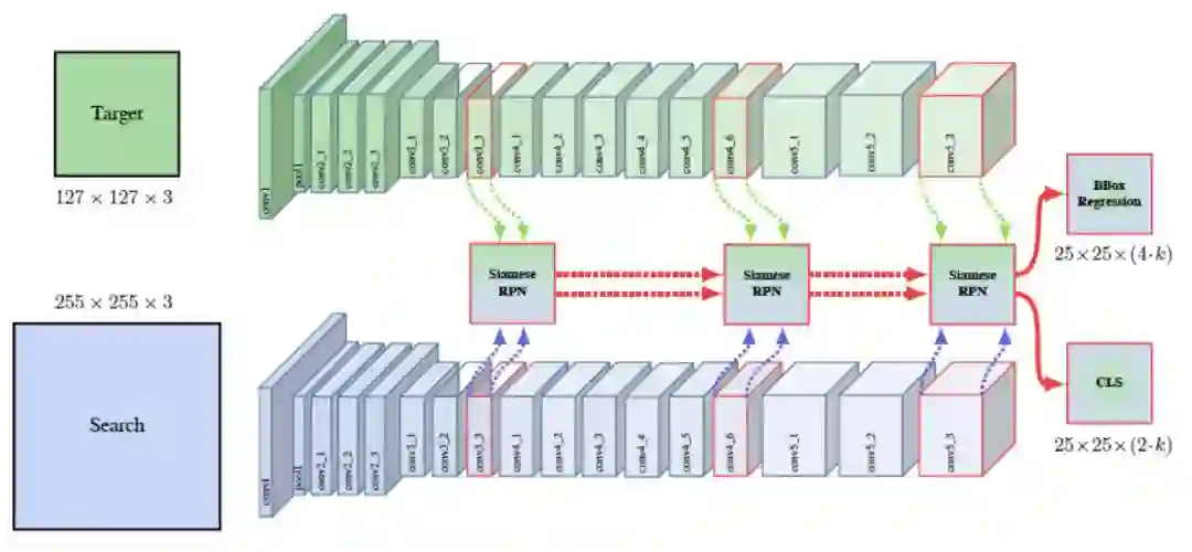 就像DSST之前的众多相关滤波跟踪算法一样,SiamFC难以应对物体尺度的变化。SiamRPN[10](CVPR18, B. Li et al.)则借鉴了目标检测领域常用的RPN(Region Proposal Network,区域生成网络)用于预测新图像中目标的尺度。