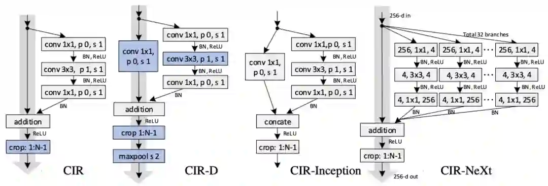 针对上述结论,作者提出了CIR(Cropping-Inside-Residial)模块以取代ResNet中的基本模块,基本做法就是下图中每个块的addition之后的crop操作,除去受padding影响的边缘部位。使用CIResNet-22作为主干的改进版SiamFC和SiamRPN都有了不小的性能提升,只是似乎这样的做法依然无法让网络变得很深?