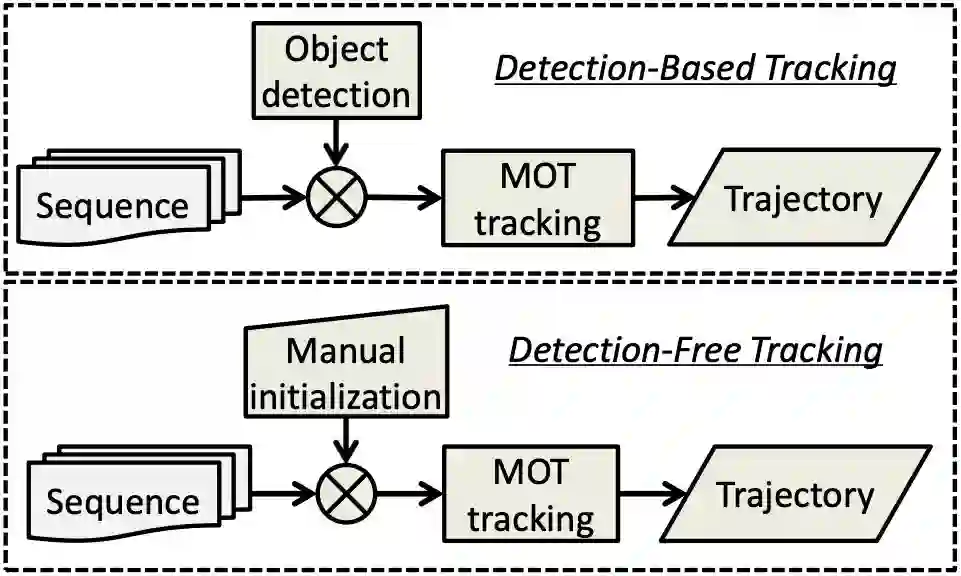 按照初始化方式,常见的多目标跟踪算法一般可分为基于检测的跟踪(Detection-Based Tracking)和无检测的跟踪(Detection-Free Tracking)。DBT要求由一个目标检测器首先将每帧图像中的目标检测出来,而DFT要求已知每个目标首次出现的位置,再对每个目标分别进行跟踪(这一点可以看作是在同一个视频中进行的多个单目标跟踪)。显然,前者的设定更接近实际应用场景,也是学界研究的主流。